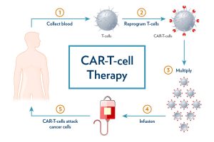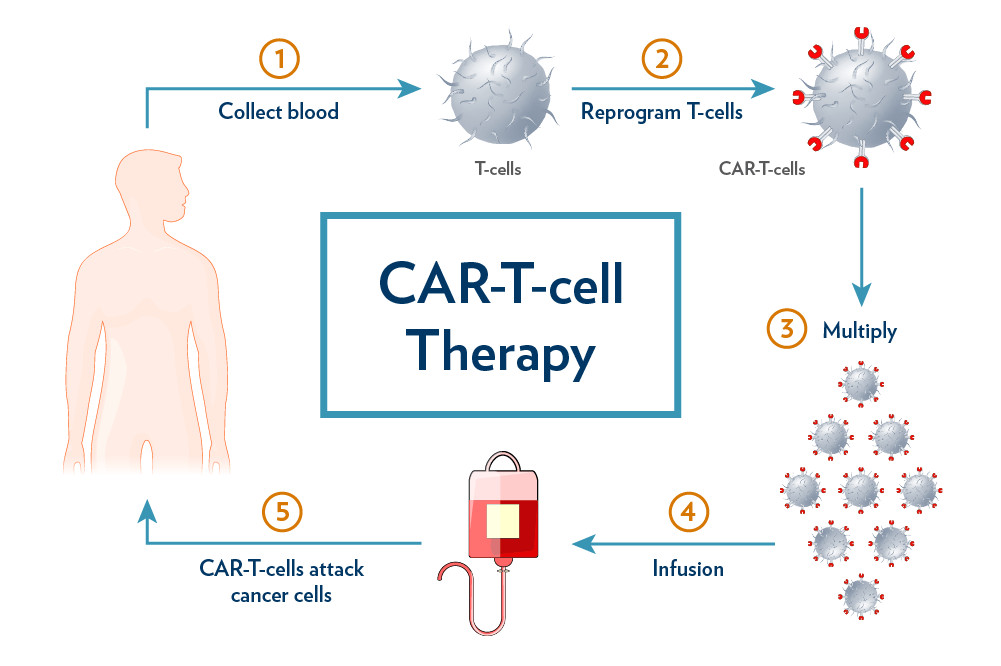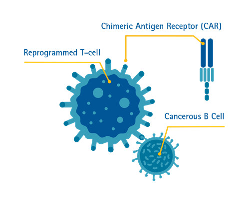 Liệu pháp CAR sử dụng tế bào T, tế bào miễn dịch của chính bệnh nhân được lập trình lại để nhận ra và tiêu diệt tế bào ung thư trên khắp cơ thể. Quá trình này bao gồm việc lấy một số tế bào T ra khỏi cơ thể bệnh nhân và thông qua các quy trình trong phòng thí nghiệm, các tế bào T này được lập trình lại để xác định các tế bào ung thư của bệnh nhân.